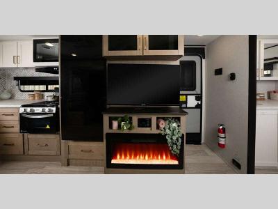 The power tongue jack and self-adjusting electric brakes make set-up a breeze so you can get to camping right away, and under mount spare tire, sewer hose storage compartment. Each model features automotive style aluminum rims. You will love the modern interior with stainless steel sink, seamless countertops throughout, and increased density foam for firmer dinette cushions.