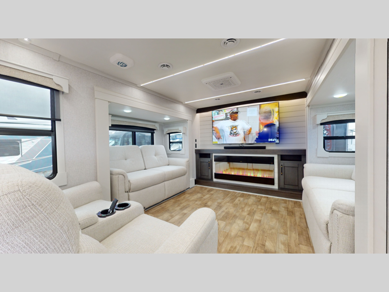 Throughout the interior you'll find residential carpet/linoleum and USB ports, and there is a central vacuum with power dust pan to use when messes happen. There is a firefly automation system, Winegard Connect 2.0 4G/Wi-Fi, 15,000 BTU Whisper Quiet A/C, and energy-efficient 35,000 BTU furnace. You will have an exciting living area filled with a 5,100 BTU fireplace, Klipsch Ceiling Speakers